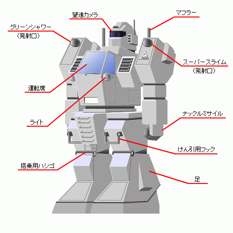 ★基本データ ・名称 PW-X970 ・製造元 住菱重機工業 ・全長 約4.5メートル ・全幅 約2.5メートル ・重量 約15トン ・動力 大型ディーゼルエンジン ・馬力 900馬力 ★各部詳細 ・望遠カメラ:遠くもよく見えるよ ・マフラー:排気ガスが出るよ ・グリーンシャワー:強化ワイヤー製の投網だよ ・スーパースライム:ゲル状の特殊粘着剤で空気に触れると数秒で固まるの ・運転席:MDデッキにCDチェンジャー、ナビゲーションシステムもついてるよ ・ライト:暗い場所でも大丈夫 ・ナックルミサイル:硬質ゴム製の拳をガス圧で飛ばすんだよ(有効射程10メートル) ・けん引用フック:動かなくなったらこれで引っ張るの ・搭乗用ハシゴ:上り下りが大変 ・足:裏にはローラーもついてるよ |